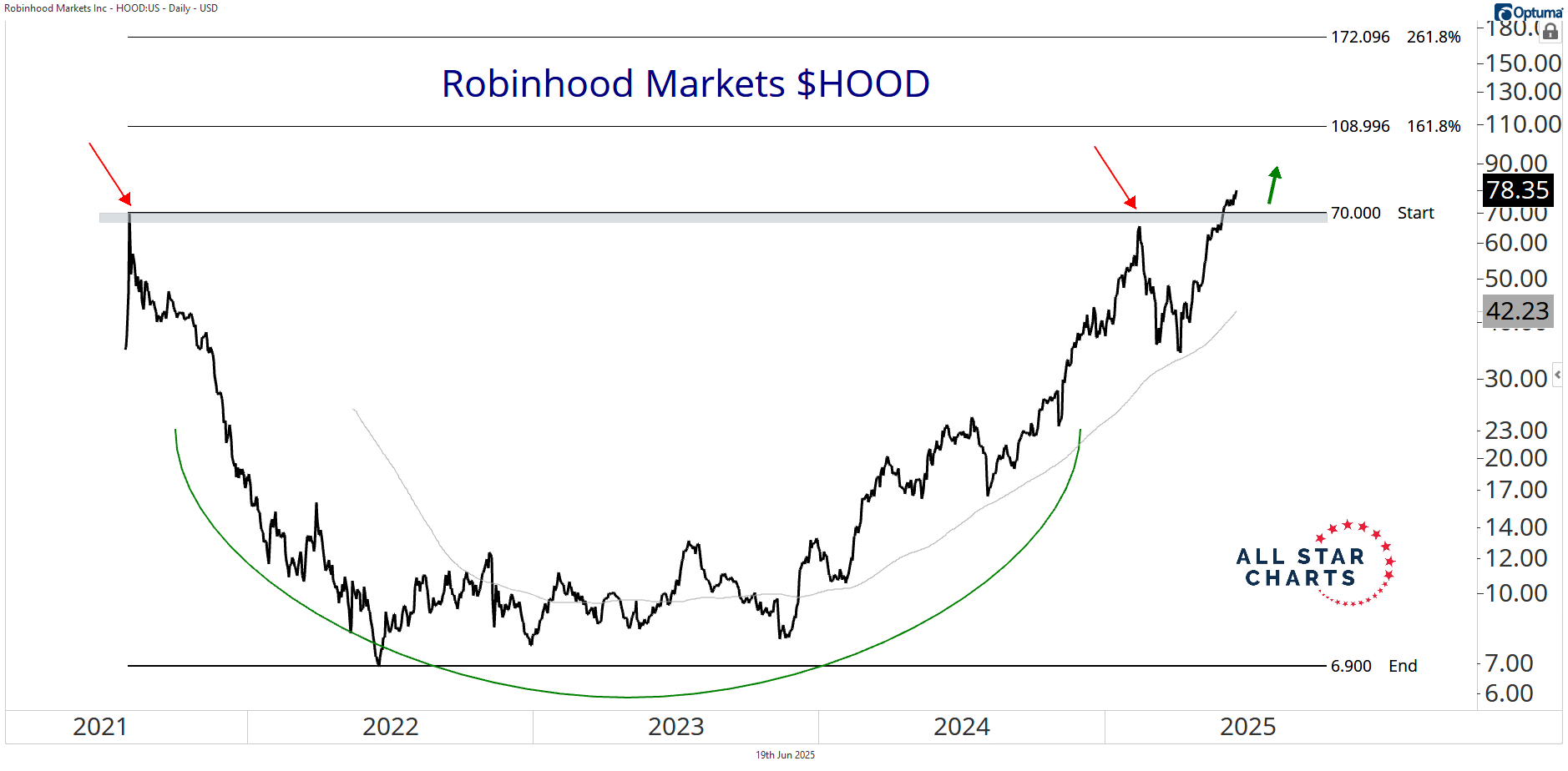 And now, HOOD is breaking out above its post-IPO highs, completing a massive multi-year base.