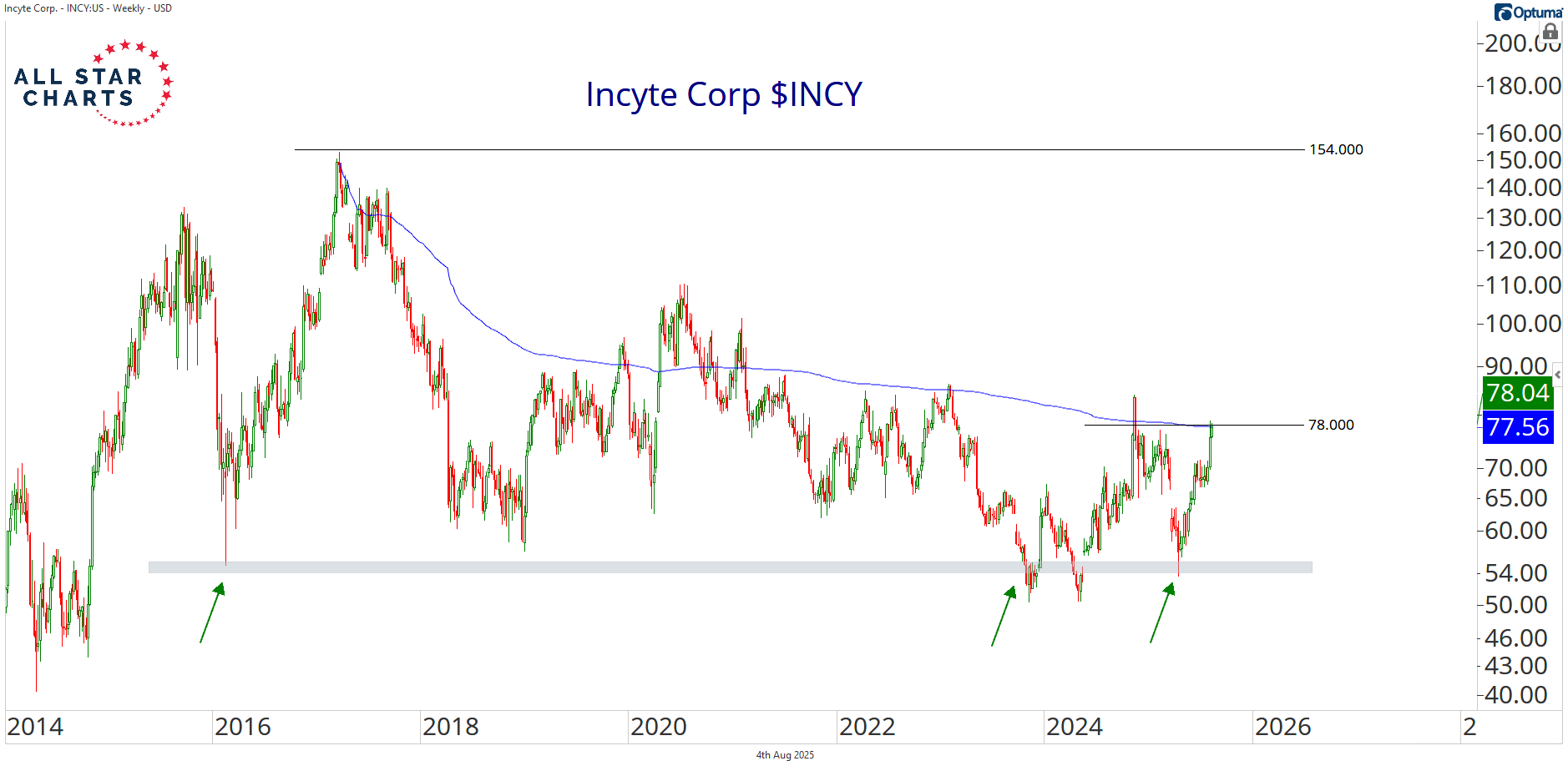 Our second setup is Incyte Corp $INCY — a biotech firm with a solid track record in cancer and inflammation treatments, best known for its blockbuster drug Jakafi.