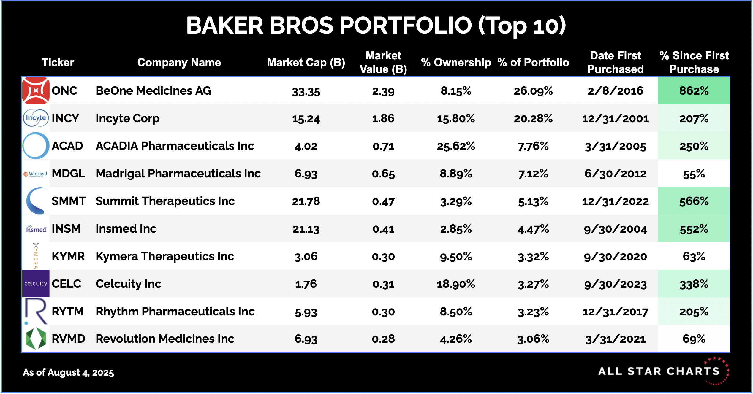 At the top is BeOne Medicines $ONC — formerly known as BeiGene — which currently makes up over a quarter of Baker Bros’ portfolio.