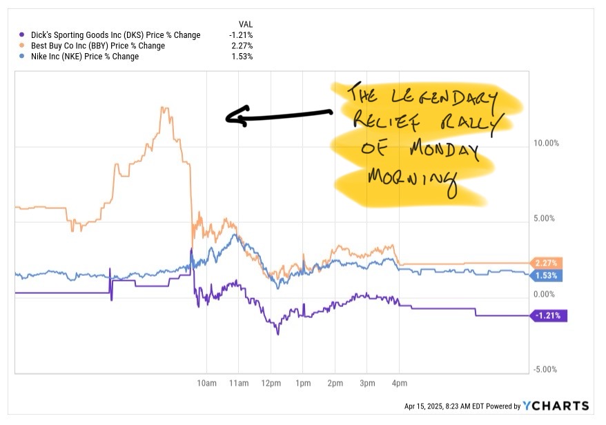 Best Buy was up over 10% pre-market and sold off instantaneously. Dicks and Nike, which stand to benefit huge if/ when the White House goes the next logical step by offering relief to apparel and sporting goods as well as chips, barely popped at all.