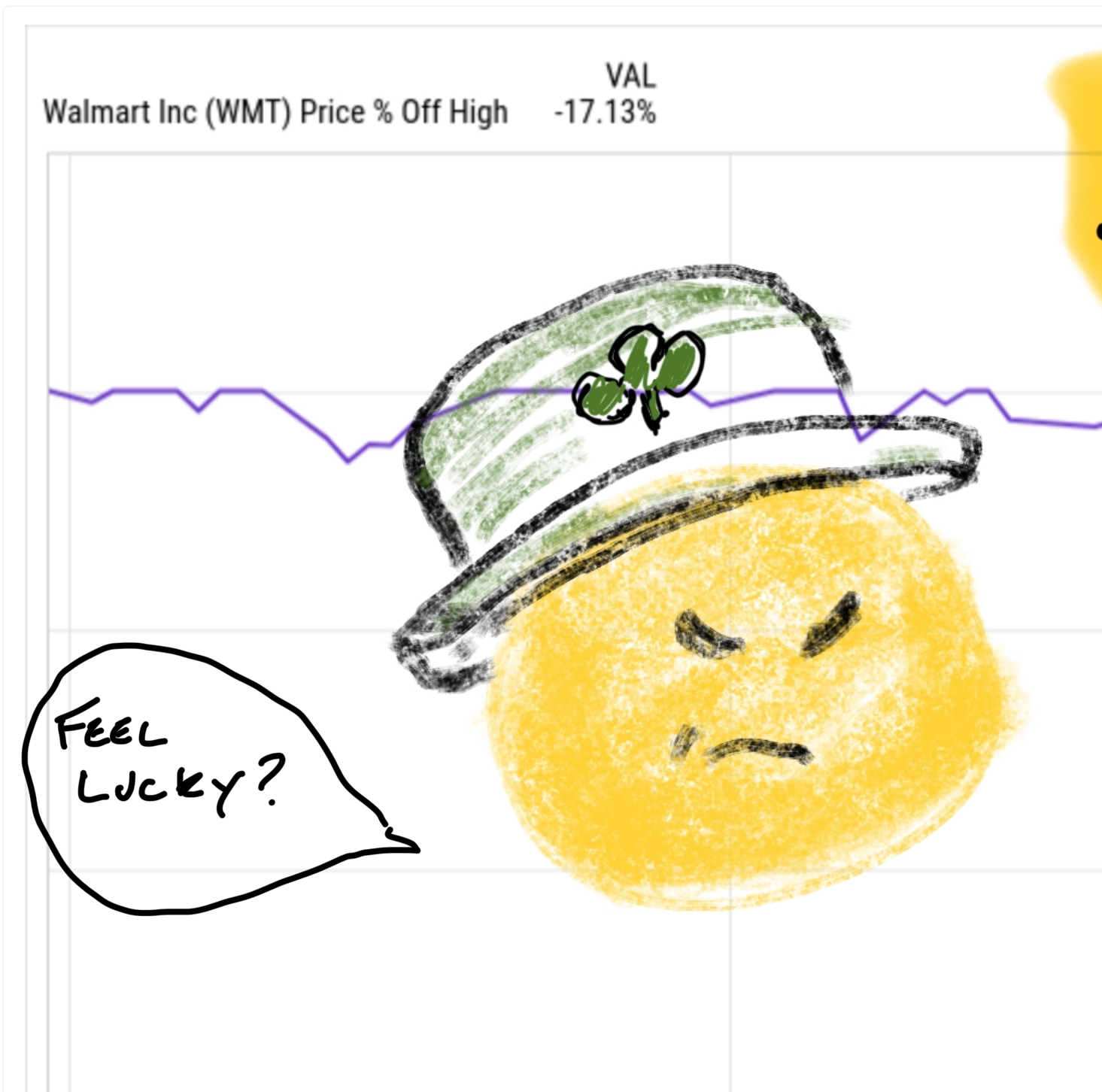 Shares of Walmart are down 17% in the month since the company took down guidance for the year based on Tariffs and the general ennui of consumers in the face of "economic uncertainty". Walmart wasn't a cheap stock at $105 but at $80 shares are pricing in a weak St Patrick's Day, a soft Easter and about a 70% chance of a lousy Christmas.