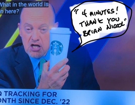 "4 minutes! 4 minutes for my (Starbucks)! Thank you very much Brian Niccol!"