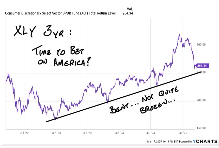Retail sales came in soft for February, with some strength in staples. Discretionary was so/so which would have seemed bad two months ago but comes as a bit of a relief in light of the bloodletting we've seen in stocks levered to the consumer over the last month.