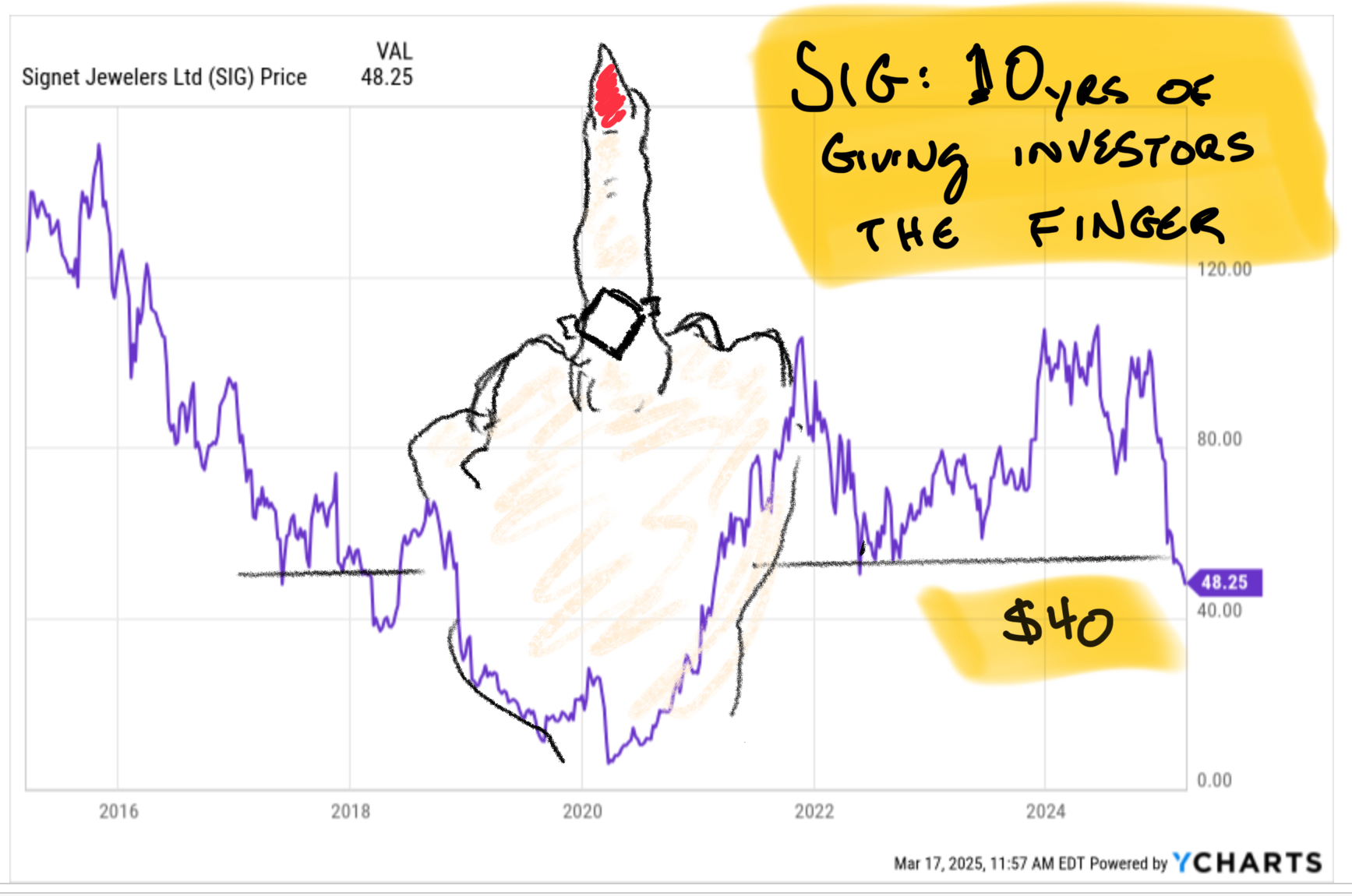 Signet trades at 5x earnings still isn't cheap. Might have support near the wrist around $40 but this isn't the part of the mall you want to go looking for bargains.