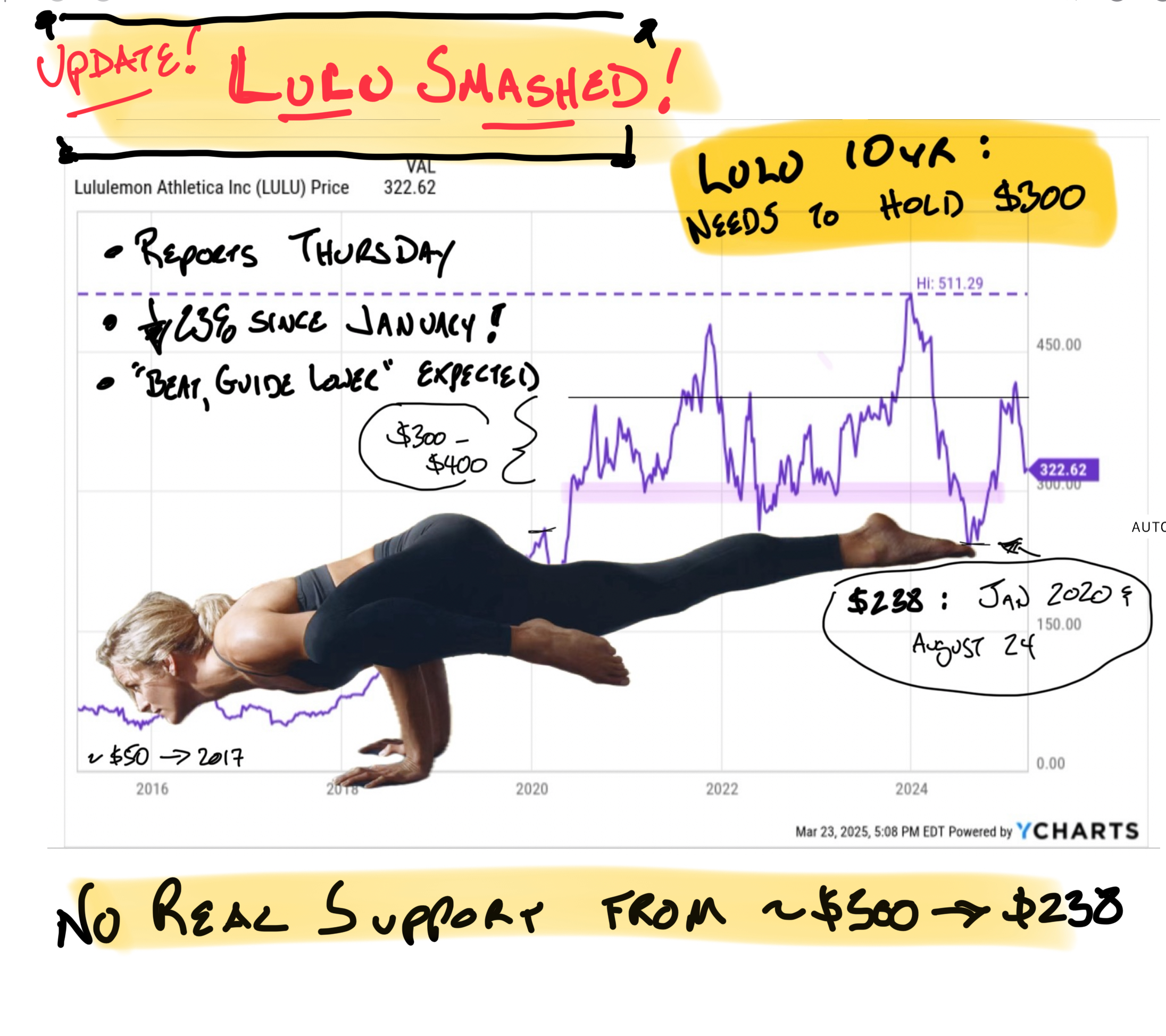 You can play the trading range, look for a bounce or try to grind out a little more on the short side of Lulu. I've got some thoughts on just that in the + space. But those are trades. It's going to be a few years before the company becomes a Buy and Hold name again.