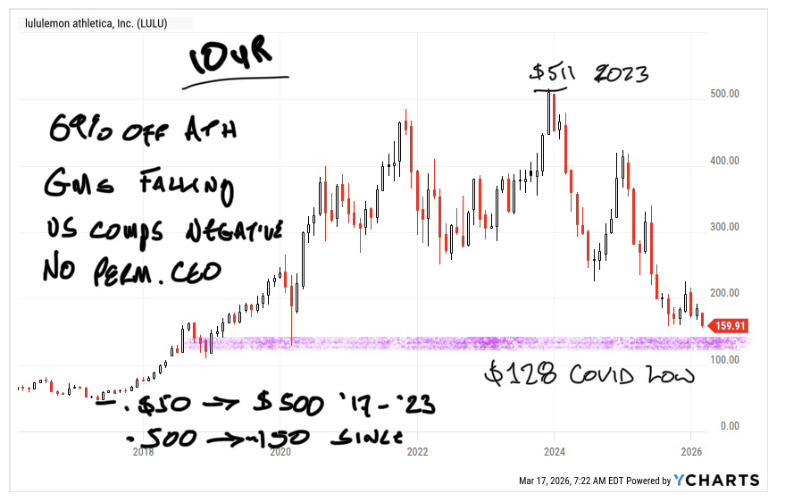 Lululemon is set to report tonight and expectations are deservedly low. One look at the ten year chart tells the Big Picture story, the one-time darling of retail (shares went up 10-fold from 2017 to 2023) is 69% off the all-time-highs and likely to guide much lower for 2027 after the bell.