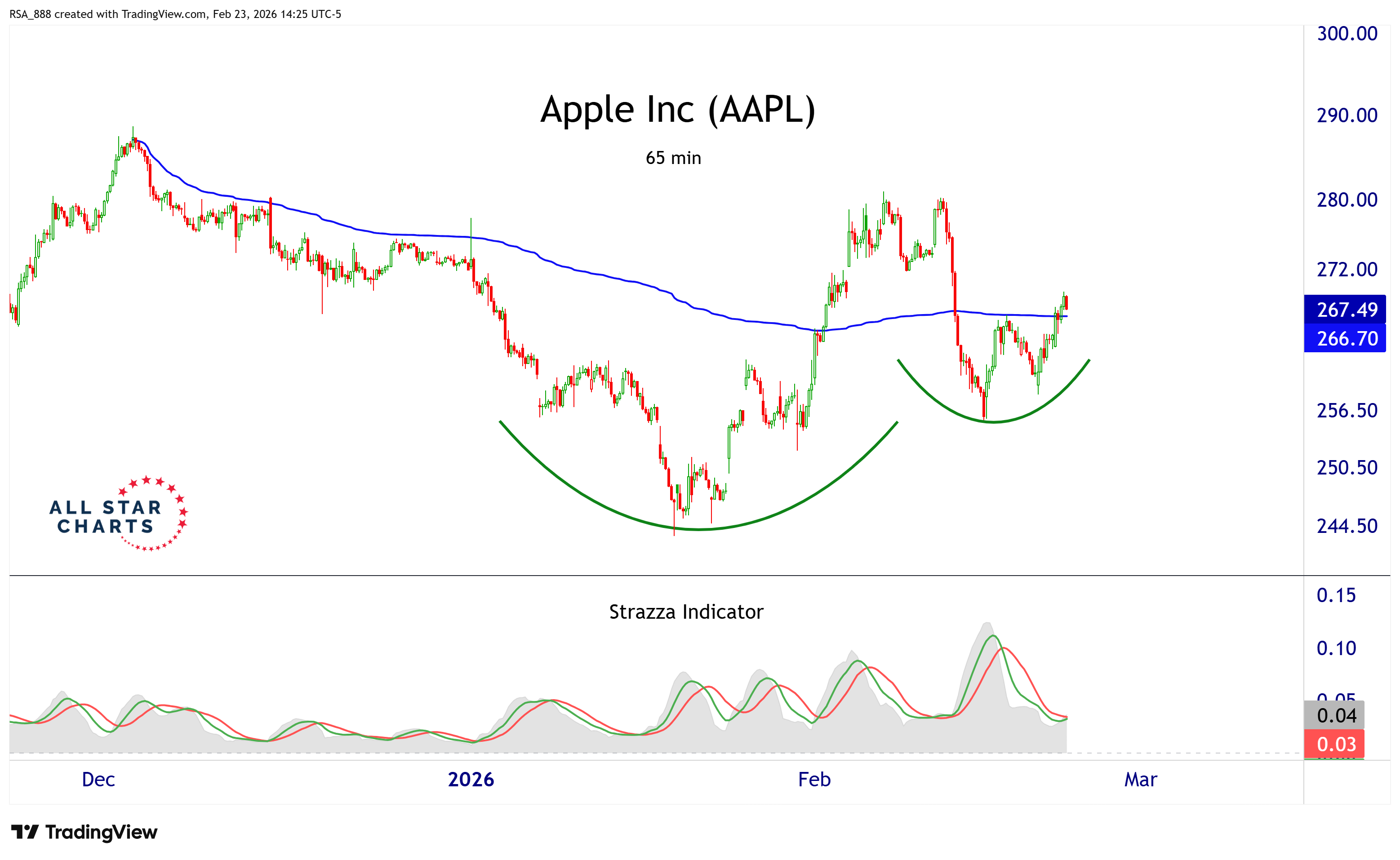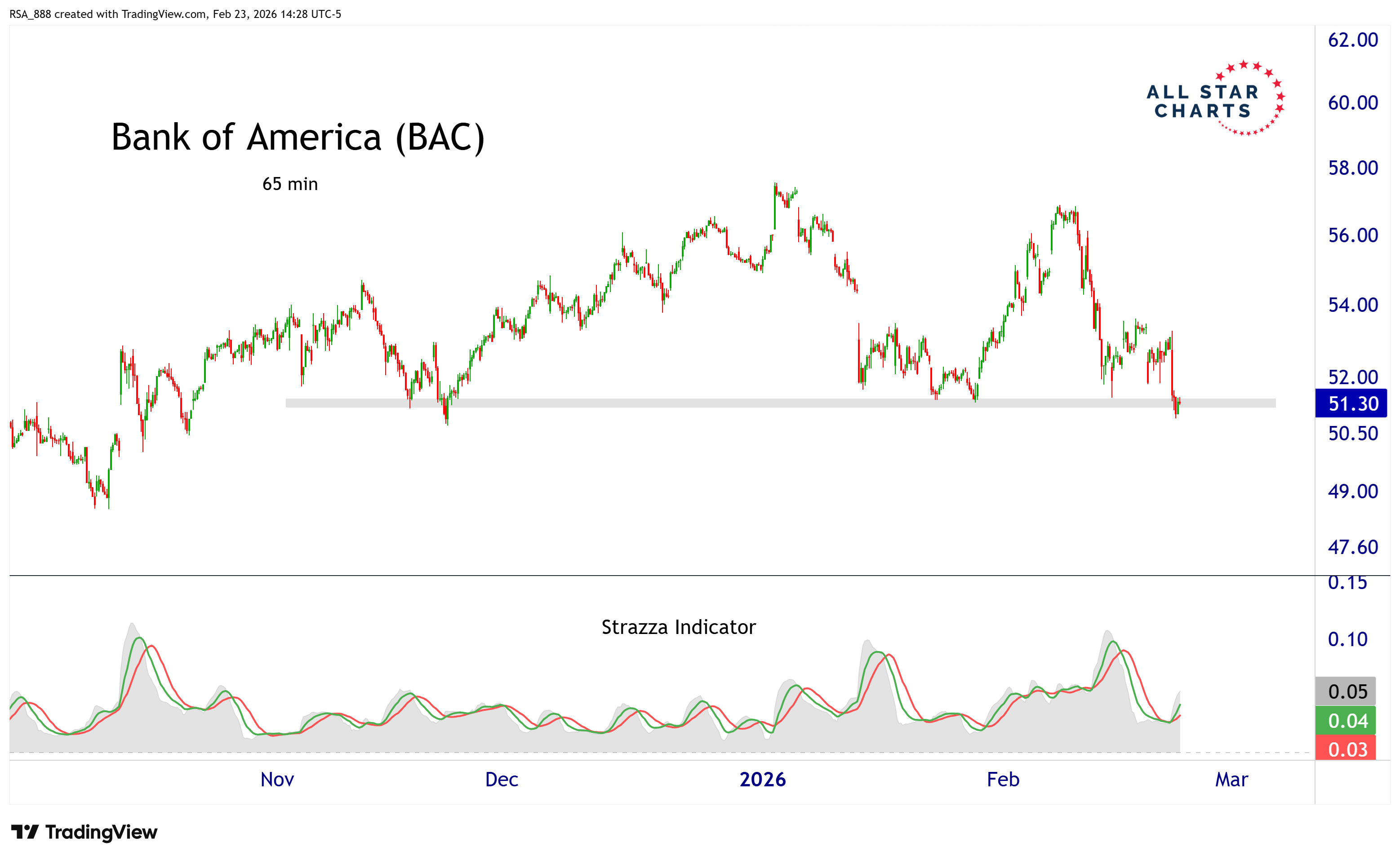 Long Apple, Short Banks February 23, 2026 We put on two tactical trades today — one leaning into strength, the other positioning for potential weakness.First, Apple Inc $AAPL.The stock has reclaimed the VWAP from the December highs, a key level that tells us buyers are regaining control of the tactical trend. At the same time, the Strazza Indicator is curling higher, signaling that a surge in volatility could be underway. I’m betting on a swift move toward 280.I bought the $AAPL 3/20 $280 calls for $2.60.On the flip side, weakness in banks caught my attention right off the bat today.Financials $XLF are completing a top — and the cleanest way to express a bearish thesis is through Bank of America $BAC.On the 65-minute chart, BAC looks vulnerable as it presses against the lower bounds of a multi-month distribution pattern. Price is hanging right at support. Short-term volatility is compressed and ready to expand. If this shelf of old lows gives way, look for a fast move to the downside.I bought the $BAC 3/6 $50 puts for $0.73.Steve Wave Trader